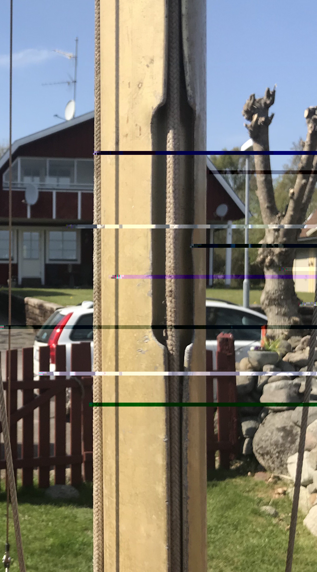 Delen som binder ihop bommen med masten, bomfäste tror jag det heter, saknas. Bommen syns till vänster på första bilden.